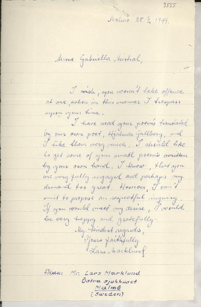 [Carta] 1949 Feb. 25, Malmõ, Sweden [a] Gabriela Mistral [manuscrito] Lars Marklund.