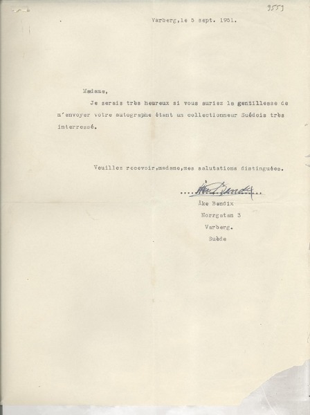 [Carta] 1951 sept. 5, Varberg, Suède [a] Gabriela Mistral [manuscrito] Åke Bendix.