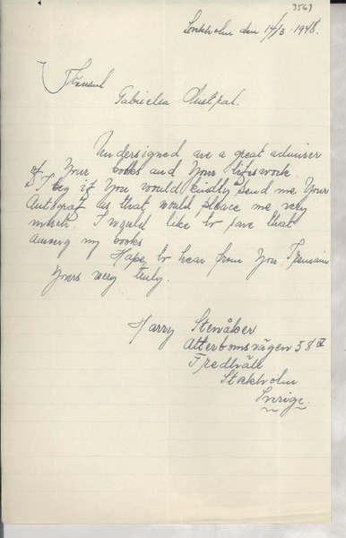 [Carta] 1948 Mar. 14, Stockholm, Sverige, [Sweden] [a] Gabriela Mistral [manuscrito] Harry Stenåber.