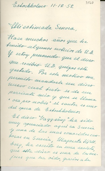 [Carta] 1952 dic. 11, Estockholmo, [Suecia] [a] Gabriela Mistral [manuscrito] Maj Valentin.