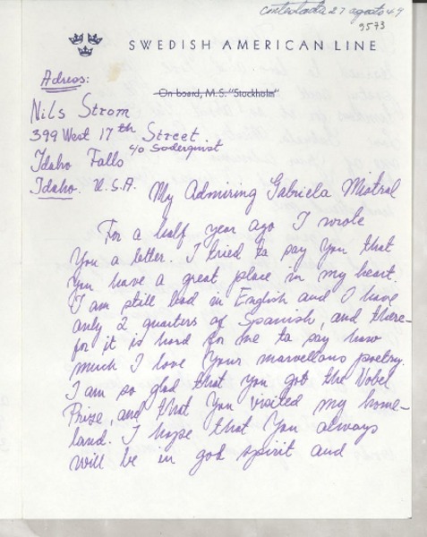 [Carta] 1949, Idaho, U.S.A. [a] Gabriela Mistral [manuscrito] Nils Strom.