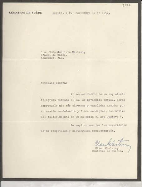 [Carta] 1950 nov. 10, México D. F. [a] Gabriela Mistral, Veracruz, México [manuscrito] Claes Westring.