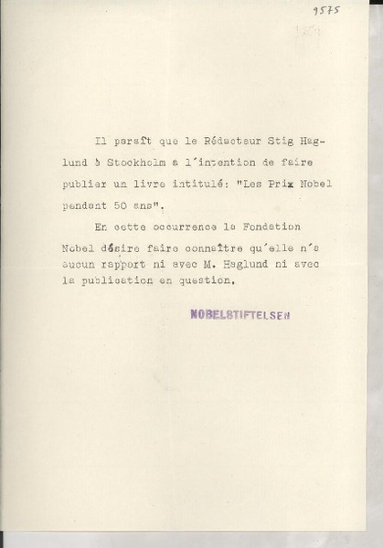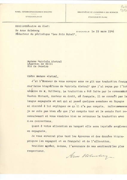 [Carta] 1946 mars 19, Stockholm 50, Suède [a la] Madame Gabriela Mistral, Légation de Chili, Rio de Janeiro, [Brasil] [manuscrito] Arne Holmberg, Bibliothècaire en Chef, Rédacteur du Périodique "Les Prix Nobel".