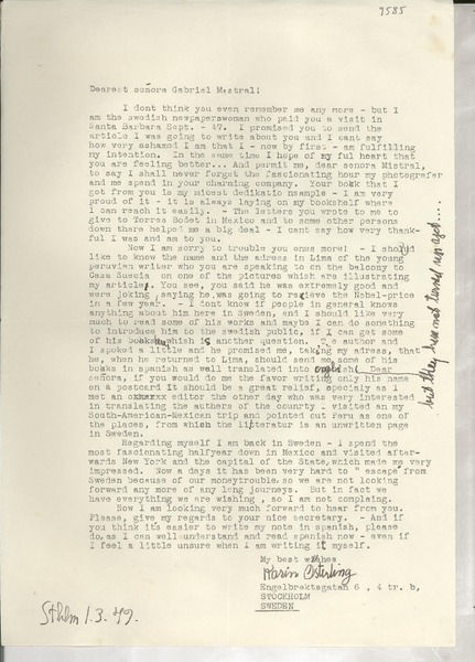 [Carta] 1949 Mar. 1, Stockholm, [Sweden] [a] Gabriela Mistral [manuscrito] Karin Osterling.