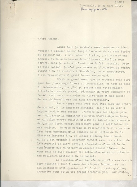 [Carta] 1951 mars 31, Stockholm [a] Gabriela Mistral [manuscrito]