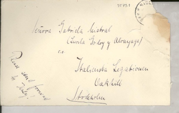 [Carta] 1954 abr. 7, Estocolmo, [Suecia] [a] Gabriela Mistral, Italia [manuscrito] Elena Régulo.