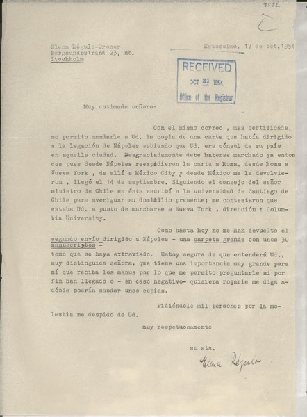 [Carta] 1954 oct. 17, Estocolmo, [Suecia] [a] Gabriela Mistral [manuscrito] Elena Régulo.