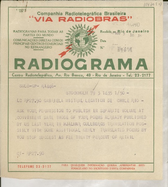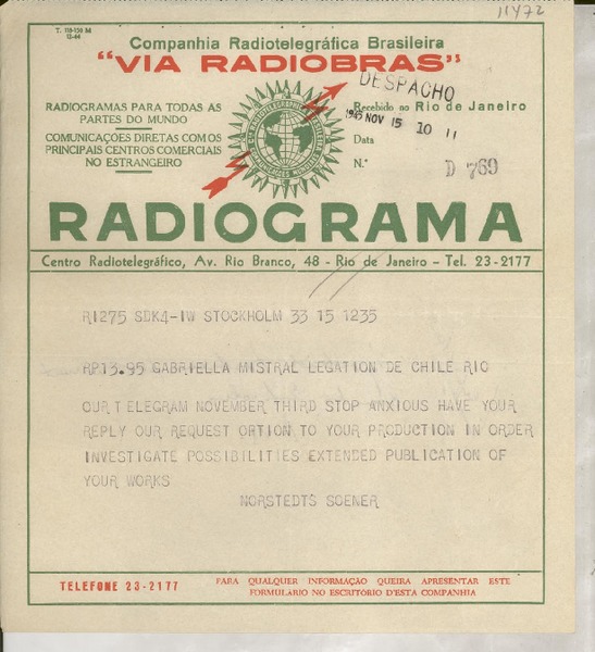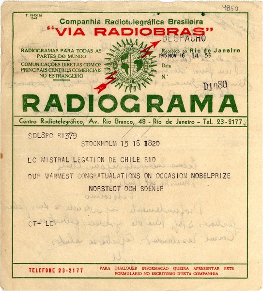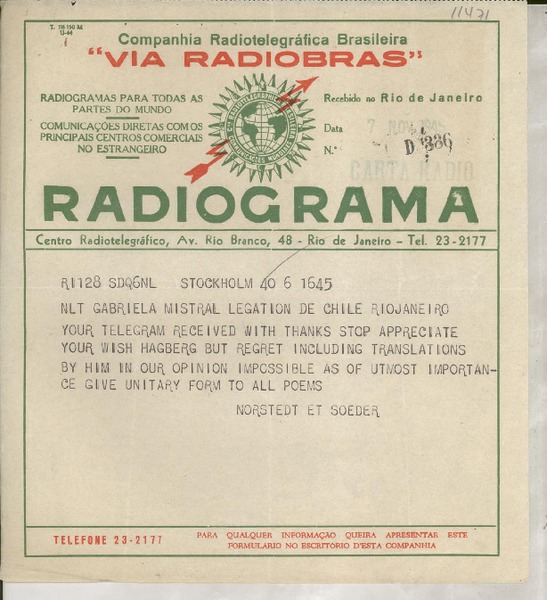 [Telegrama] 1945 nov. 16, Stockholm, [Sweden] [a] Gabriela Mistral, Rio, [Brasil] [manuscrito] Norstedt Och Soëner.