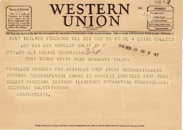 [Telegrama] 1946 nov. 29, Stockhom, [Suisse] [a] Gabriela [Mistral], Monrovia, Calif., [EE.UU.] [manuscrito] Northstedts.