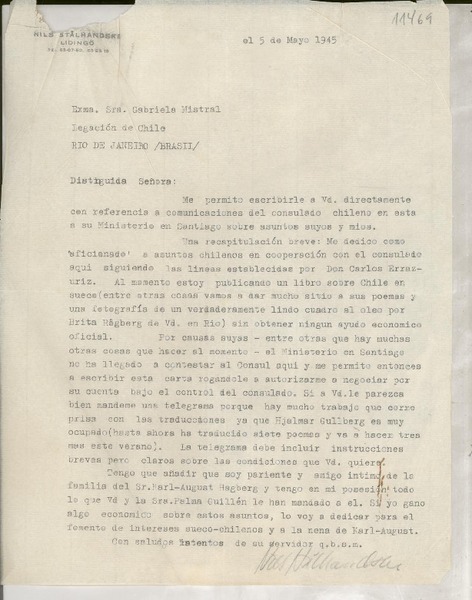 [Carta] 1945 mayo 5, [Suecia] [a la] Exma. Sra. Doña Gabriela Mistral, Legación de Chile, Rio de Janeiro, Brasil [manuscrito] Nils Stålhandske.