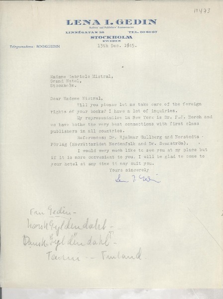 [Carta] 1945 Dec. 13, Stockholm, Sweden [a] Madame Gabriele [i.e. Gabriela] Mistral, Grand Hotel, Stockholm, [Sweden] [manuscrito] Lena I. Gedin.