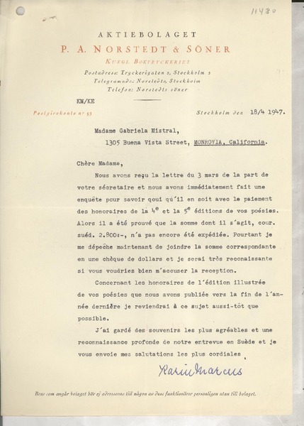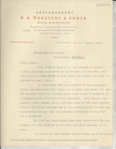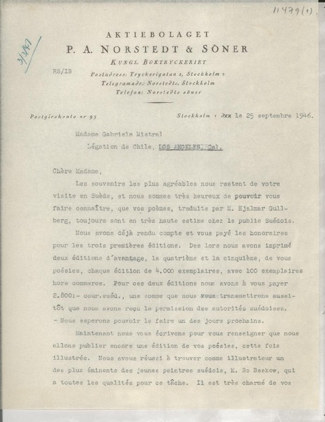 [Carta] 1946 sept. 25, Stockholm, [Suecia] [a] Madame Gabriela Mistral, Legation de Chile, Los Angeles, Cal. [manuscrito] P. A. Norstedt & Söner.