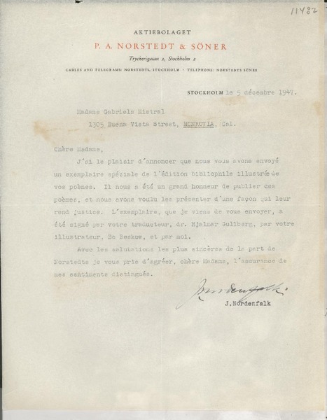 [Carta] 1947 déc. 5, Stockholm, [Suecia] [a] Madame Gabriela Mistral, Monrovia, Cal. [manuscrito] J. Nordenfalk.