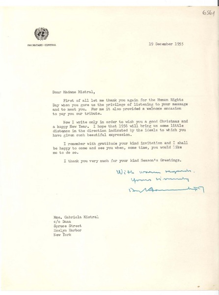 [Carta] 1955 Dec. 19, [Estados Unidos] [a] [Gabriela] Mistral, Roslyn Harbor, New York [manuscrito] Dag Hammarskjöld.