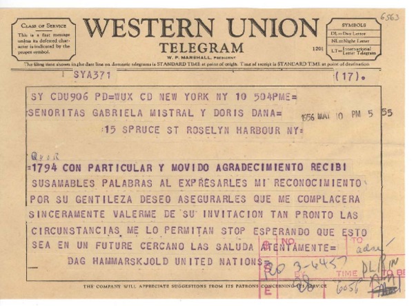 [Telegrama] 1956 May 10, New York, [EE.UU.] [a] Gabriela Mistral and Miss Doris Dana, 15 Spruce St, Roselyn Harbour, NY, [EE.UU.] [manuscrito] Dag Hammarskjöld.