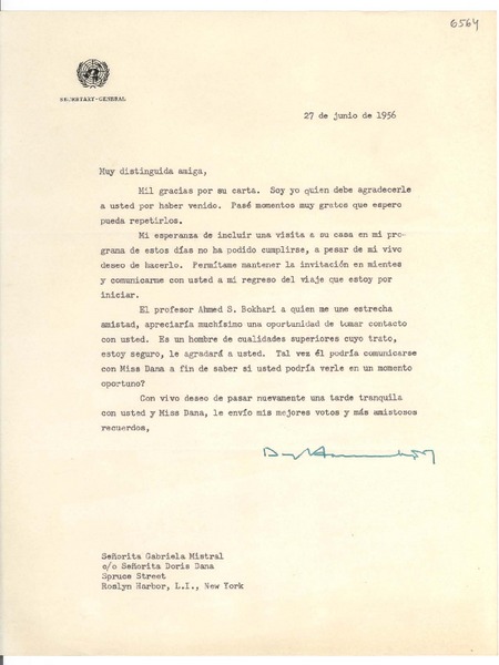 [Carta] 1956 jun. 27, [New York, Estados Unidos] [a] [Gabriela Mistral, Roslyn Harbor, New York [manuscrito] Dag Hammarskjöld.