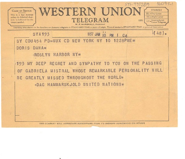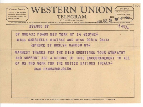 [Telegrama] 1956 Oct. 24, New York, [EE.UU.] [a] Gabriela Mistral and Miss Doris Dana, Spruce St, Roslyn Harbor, NY, [EE.UU.] [manuscrito] Dag Hammarskjöld.
