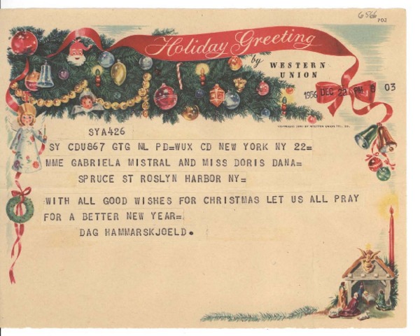 [Telegrama] 1956 Dec. 22, New York, [EE.UU.] [a] Gabriela Mistral and Miss Doris Dana, Spruce St, Roslyn Harbor, NY, [EE.UU.] [manuscrito] Dag Hammarskjoeld [i.e. Hammarskjöld].