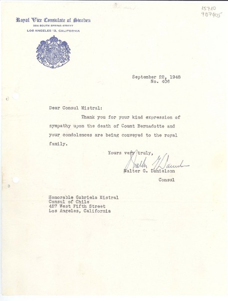[Oficio] N° 406, 1948 Sept. 22, Los Angeles 13, California, [EE.UU.] [a la] Honorable Gabriela Mistral, Consul of Chile, 427 West Fifth Street, Los Angeles, California, [EE.UU.] [manuscrito] Walter G. Danielson.