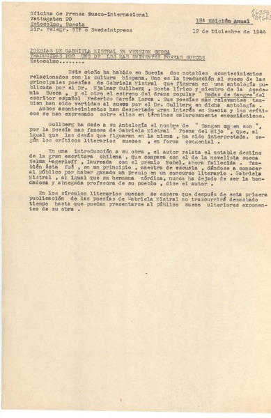 [Memorandum] 1944 dic. 12, Oficina de Prensa Sueco-Internacional, Vattugatan 20, Estocolmo, Suecia, Dir. Telegr. SIP o Swedeintpress [manuscrito]