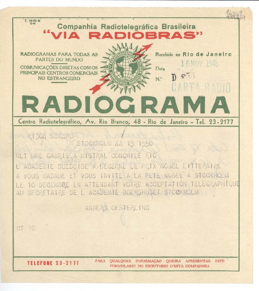 [Telegrama] 1945 nov. 16, Stockholm, [Sweden] [a] Gabriela Mistral, ConChile, Rio, [Brasil] [manuscrito] Anders Oesterling.