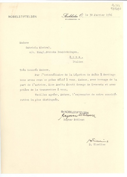 [Carta] 1946 janv. 30, Stockholm, [Sweden] [a la] Madame Gabriela Mistral, co Kungl. Svenska Beskickningen, Roma, Italien [manuscrito] / Ragnar Sohlman, D. Tiselius.