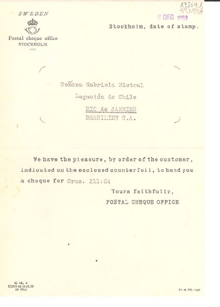 [Carta] 1952 Dec. 6, Stockholm, Sweden [a la] Señora Gabriela Mistral, Legación de Chile, Rio de Janeiro, Brasilien S.A., [Brazil] [manuscrito] Postal Cheque Office.