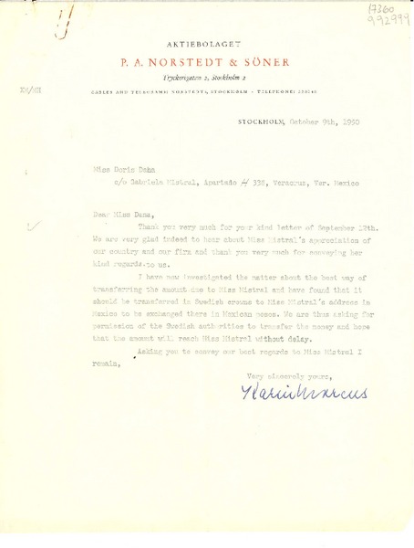 [Carta] 1950 Oct. 9, Aktiebolaget P. A. Norstedt & Soner, Tryckerigatan 2, Stockholm 2, [Sweden] [a] Miss Doris Dana, co Gabriela Mistral, Apartado 338, Veracruz, Ver., Mexico [manuscrito] / Karin Marcus.