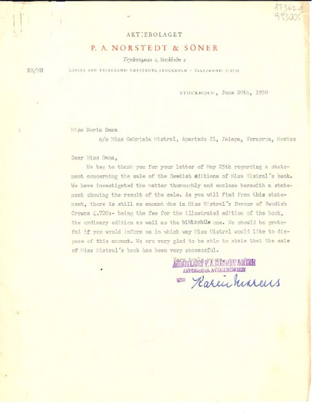 [Carta] 1950 June 20, Aktiebolaget P. A. Norstedt & Soner, Tryckerigatan 2, Stockholm 2, [Sweden] [a] Miss Doris Dana, co Miss Gabriela Mistral, Apartado 21, Jalapa, Veracruz, Mexico [manuscrito] / Karin Marcus.