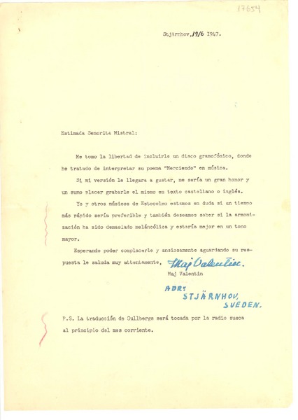 [Carta] 1947 jun. 19, Stjärnhov, Sweden [a] Gabriela Mistral [manuscrito] Maj Valentin.