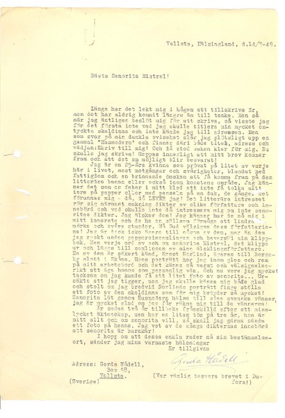 [Carta], 1949 mar. 14, Vallsta, Hälsingland, Suecia [a] Gabriela Mistral [manuscrito] Gerda Hådell.