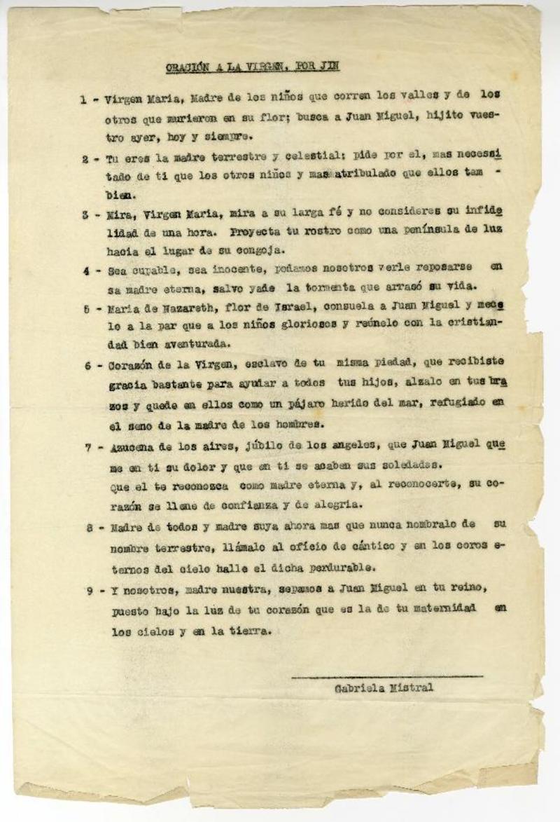 Oración a la Virgen, por Jin [manuscrito] Gabriela Mistral.