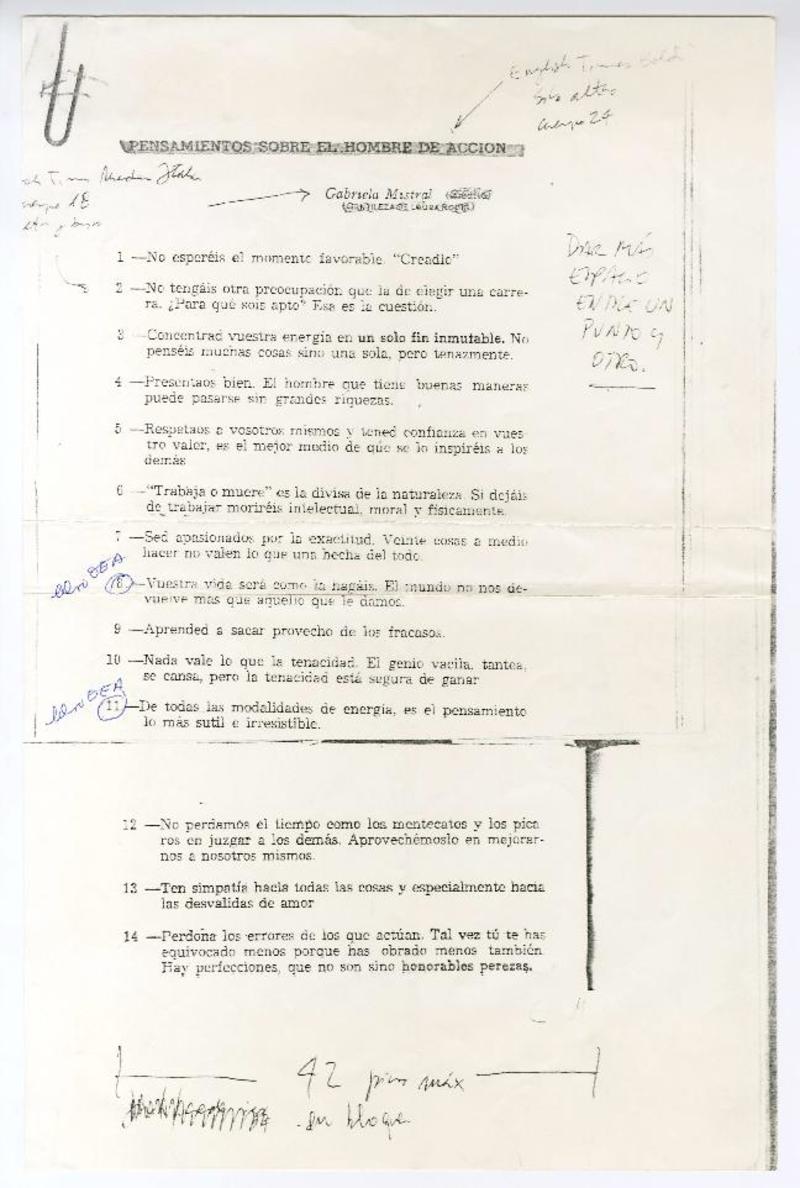 Pensamientos sobre el hombre de acción [manuscrito] Gabriela Mistral.