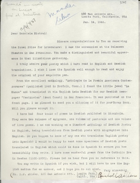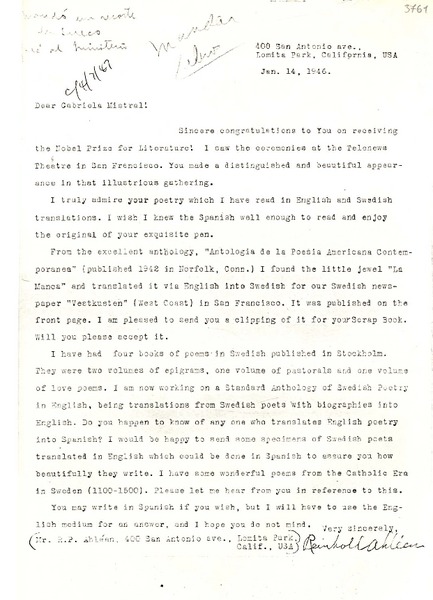 [Carta] 1946 ene. 14, Lomita Park, California, EE.UU. [a] Gabriela Mistral [manuscrito] Reinhold P. Ahléen.
