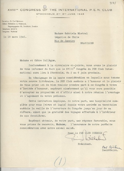 [Carta] 1946 mars 18, Stockholm, [Sweden] [a] Gabriela Mistral, Rio de Janeiro, [Brasil] [manuscrito] Carl Björkman.