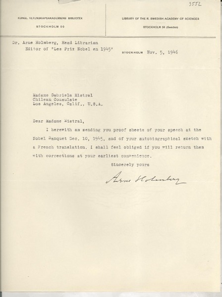[Carta] 1946 Nov. 5, Stockholm [a] Gabriela Mistral, Los Ángeles, California, U. S. A. [manuscrito] Arne Holmberg.
