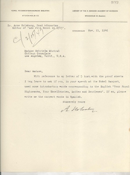 [Carta] 1946 Nov. 11, Stockholm [a] Gabriela Mistral, Los Ángeles, California, U. S. A. [manuscrito] Arne Holmberg.
