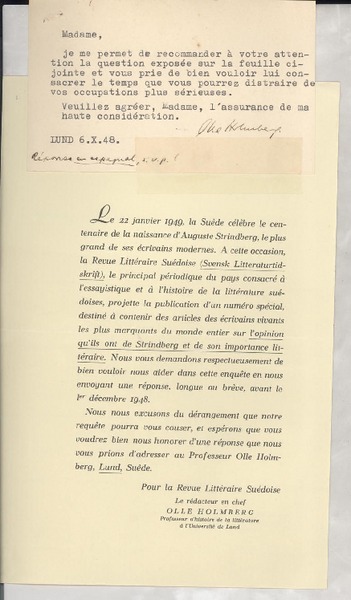 Mistral, Gabriela - Autores suecos - Holmberg, Arne - Correspondencia - Manuscritos suecos