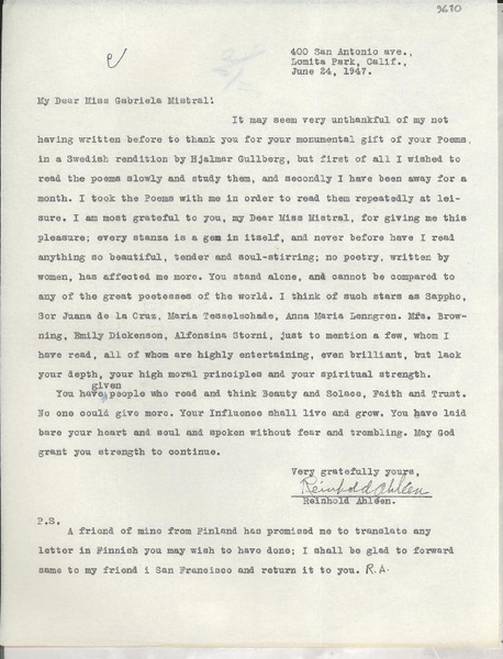 [Carta] 1947 June 24, Lomita Park, California, [EE.UU.] [a] Gabriela Mistral [manuscrito] Ahléen Reinhold.