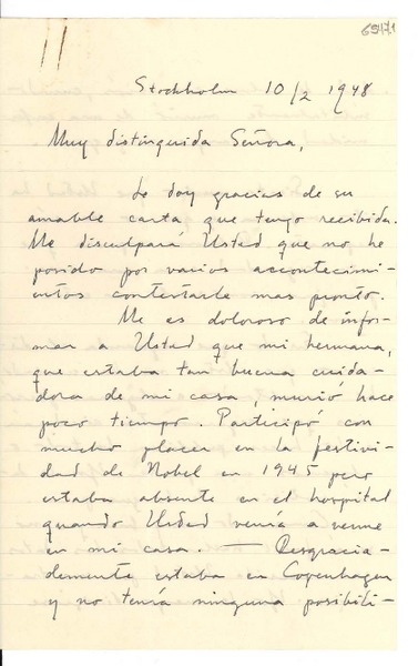 [Carta] 1948 feb. 10, Estocolmo [a] Gabriela Mistral [manuscrito] Hjalmar Gullberg.