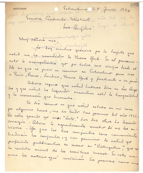 [Carta] 1946 jun. 28, Estocolmo [a] Gabriela Mistral, Los Ángeles [manuscrito] Hjalmar Gullberg.