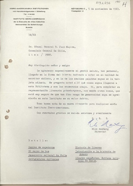 Hedberg, Nils - Correspondencia - Autores chilenos - Mujica, Juan - Manuscritos suecos - Autores suecos