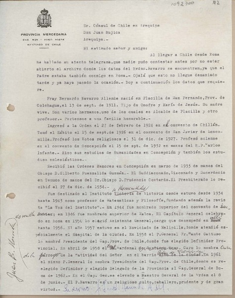 [Carta] [1962], Santiago, Chile [a] Juan Mujica, Arequipa, Perú [manuscrito] Juan B. Herrada.