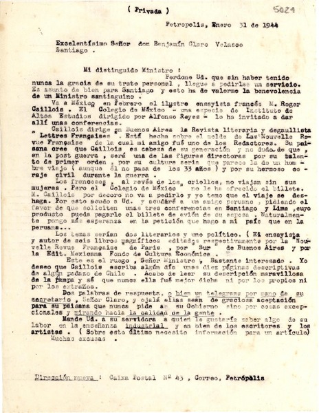 [Carta] 1944 ene. 31, Petrópolis, [Brasil] [a] Benjamín Claro Velasco, Santiago, [Chile] [manuscrito] [Gabriela Mistral].