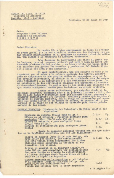 [Carta] 1944 jun. 30, Santiago, [Chile] [al] Señor Benjamín Claro Velasco, Ministro de Educación, [Chile] [manuscrito] Carlos de Vidts V.