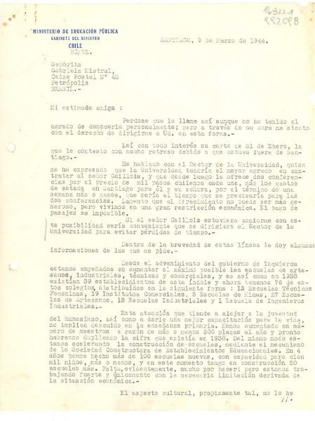 [Carta] 1944 mar. 9, Santiago, [Chile] [a la] Señorita Gabriela Mistral, Caixa Postal N° 43, Petrópolis, Brasil [manuscrito] Benjamín Claro V.