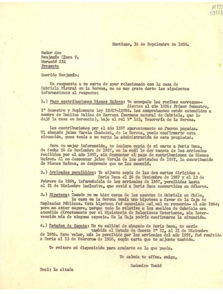 [Carta] 1958 sept. 16, Santiago [a] Señor don Benjamín Claro V., Morandé 231 [manuscrito] Radomiro Tomic.