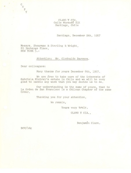 [Carta] 1957 dic. 9, Santiago, Chile [a] Messrs. Sherman & Sterling & Wright, New York [manuscrito] Benjamín Claro V.