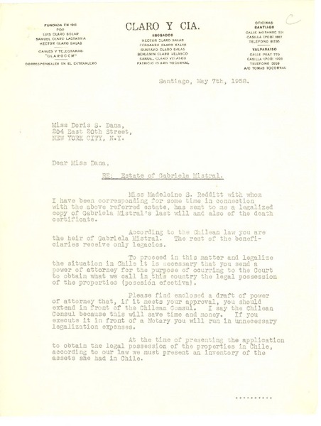 [Carta] 1958 may. 7, Santiago, Chile [a] Miss Doris Dana, New York [manuscrito] Benjamín Claro V.