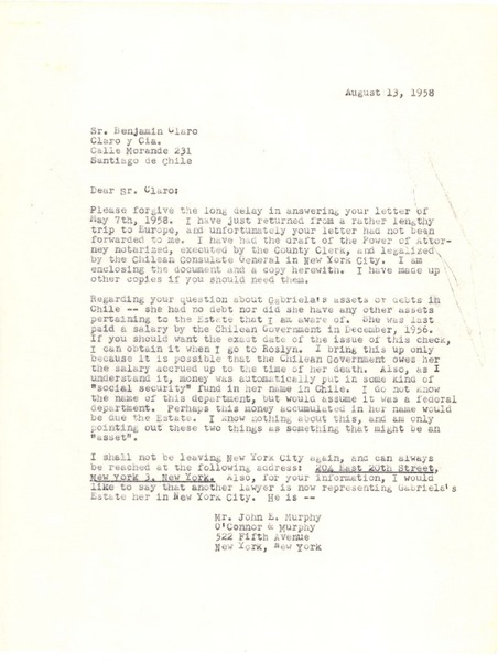 [Carta] 1958 ago. 13, New York [a] Benjamín Claro, Santiago, Chile [manuscrito] Doris Dana.